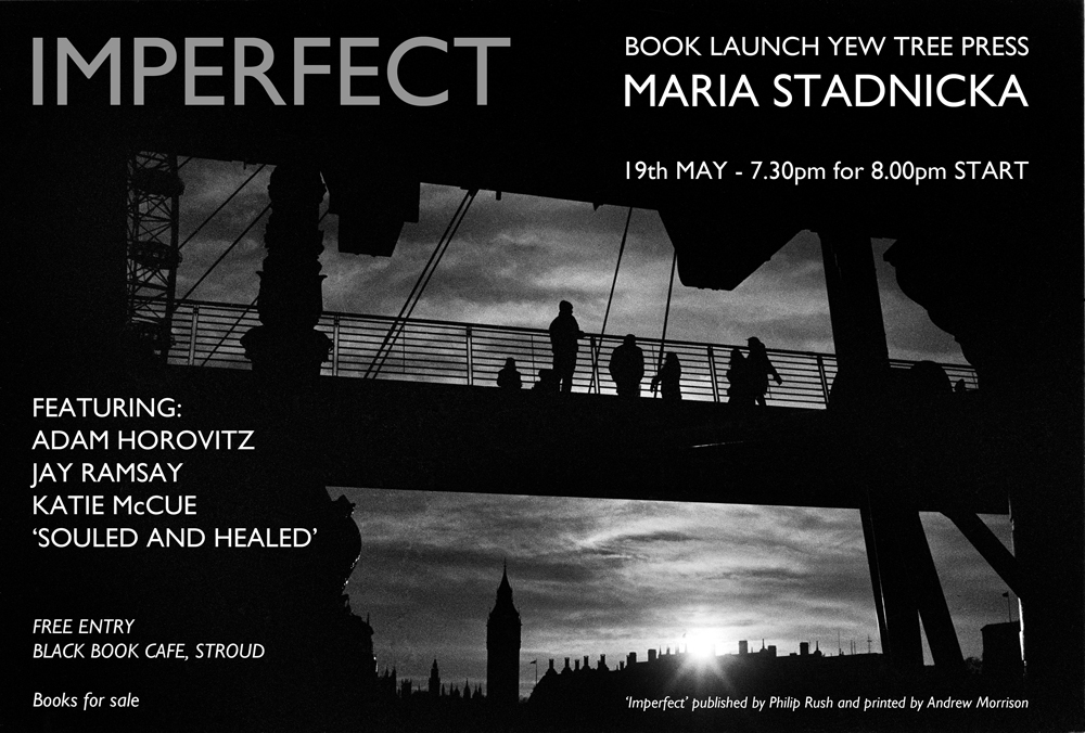 This is it. The book is done, the summer arrived. ‘Imperfect’ is published by Yew Tree Press, Philip Rush, Stroud, Gloucestershire, UK and printed by Andrew Morrison, Stroud, UK. Price: £10 with free P&P.